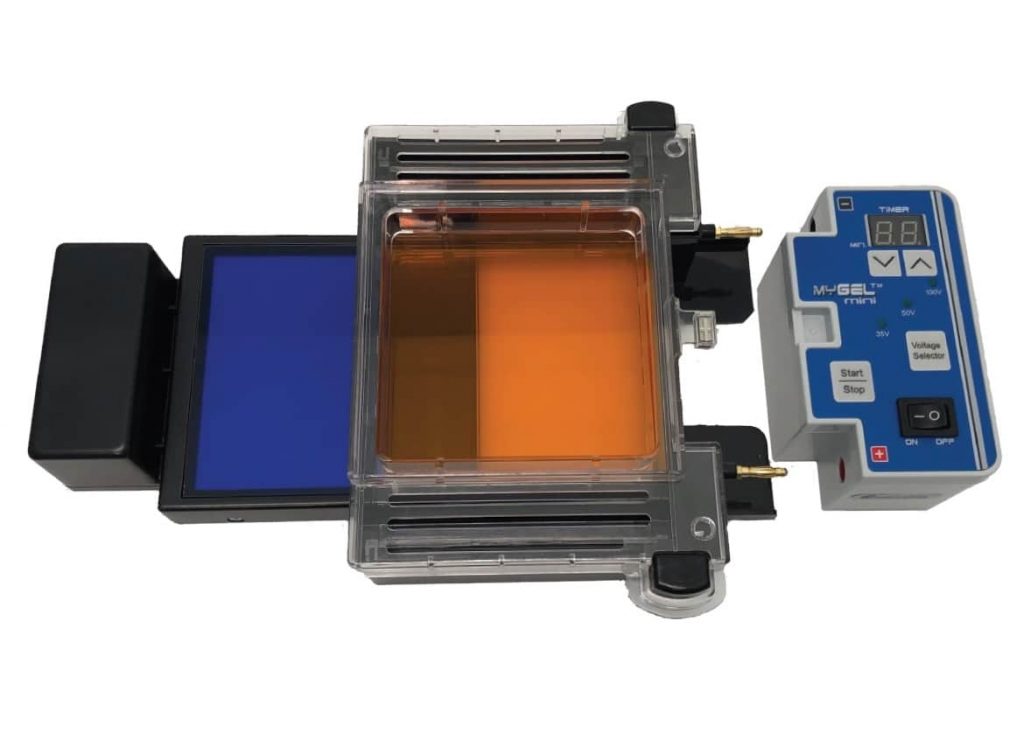 The myGel InstaView comes complete with everything needed to cast, run and view mini electrophoresis gels, including an integrated power supply. One large (10.5x10cm) or small (10.5x6cm) gel is accommodated by the gel tank. Gels are easily poured using the supplied trays, combs and leak-proof casting stand. The power supply connects directly into the gel tank – no more leads to contend with. The connection is guaranteed to be right, every time.