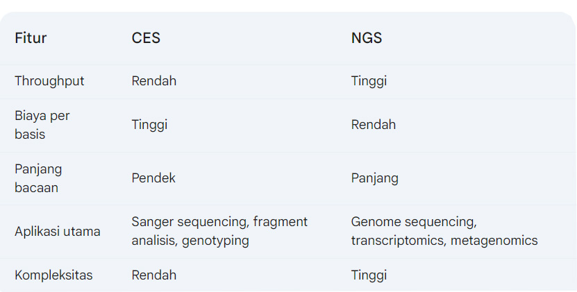 CES dan NGS memiliki peran yang berbeda dalam penelitian genetik. CES cocok untuk proyek-proyek dengan sampel terbatas dan kebutuhan akurasi tinggi untuk urutan pendek, sementara NGS adalah pilihan ideal untuk proyek-proyek besar yang membutuhkan analisis genomik komprehensif. Dalam beberapa kasus, kedua teknologi dapat digunakan secara komplementer untuk mendapatkan hasil yang lebih baik.